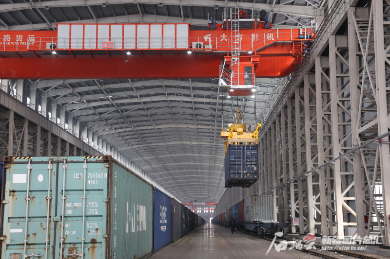 “轟隆轟隆……”室內,一列列裝滿貨物的列車,從阿拉山口站集裝箱換裝庫有序地駛進又駛出。
