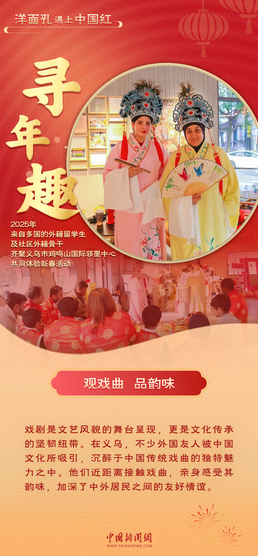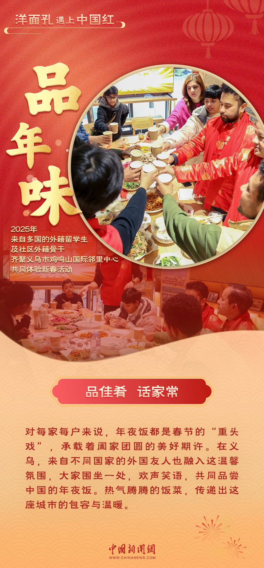 當(dāng)“洋面孔”遇上“中國紅”,一場跨越文化的交融在義烏上演。紅火的對聯(lián)、熱鬧的戲劇表演、香甜的年夜飯……外國友人們沉浸在中國年的喜慶氛圍中,感受著這份獨(dú)特的溫暖與歡樂。義烏的年味,不僅溫暖了“世界老鄉(xiāng)”的心,也讓全球各個(gè)地方看到了中國年的魅力與溫度。