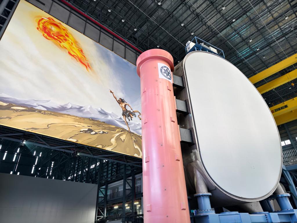 在11號廠房,墻壁上高達十幾米的夸父逐日畫像,襯托著一座形似“橘子瓣”的巨大腔體,讓科技藍為主色調(diào)的空間里有了活躍的神韻。未來,八個這樣的“橘子瓣”合而為一,下一代“人造太陽”將在里頭進行“燃燒”實驗。
