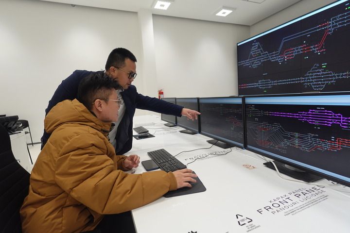 春節(jié)前夕,在匈塞鐵路塞爾維亞段項(xiàng)目位于諾維薩德的調(diào)度指揮中心,項(xiàng)目副總工程師楊冠嶺(后)詢問線路試運(yùn)行情況。新華社記者 陳穎 攝