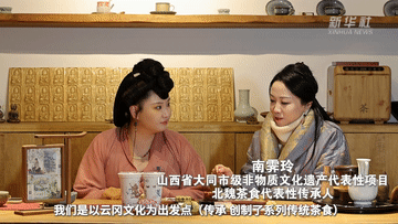 在云岡石窟景區(qū)內(nèi)的一家北魏茶食非遺體驗(yàn)店內(nèi),游客們正品嘗、購置著各式各樣的傳統(tǒng)茶食。