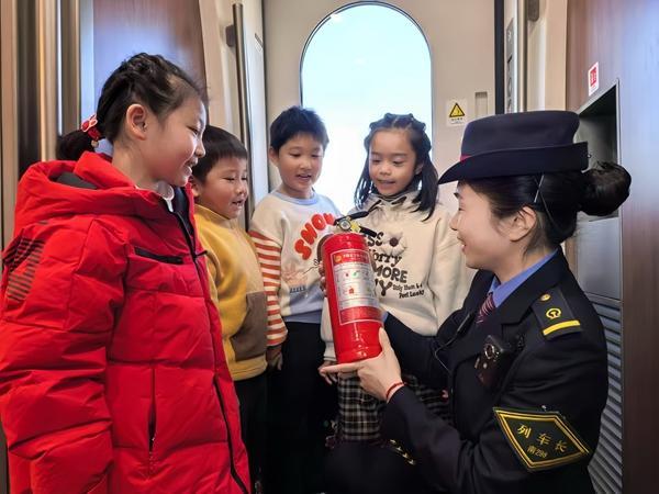 春運(yùn)期間,南昌客運(yùn)段組織開(kāi)展安全乘車(chē)小課堂。圖為G1584次列車(chē)乘務(wù)員在給小朋友講解列車(chē)消防設(shè)備設(shè)施的使用。王夢(mèng)婧子/攝