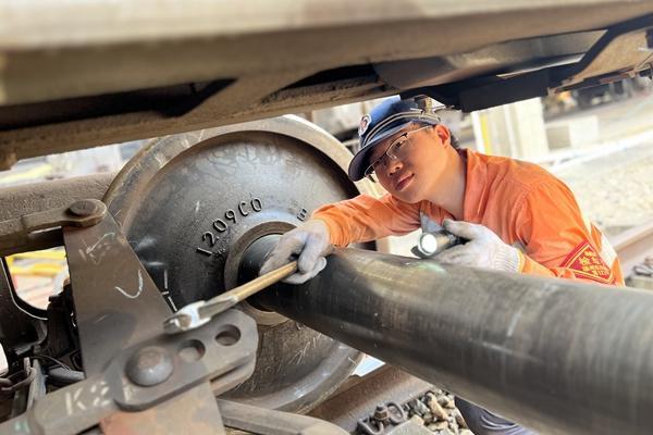 1時(shí)30分,作業(yè)人員攜帶道尺、檢查錘、油壺等材料工具,向站場(chǎng)西邊進(jìn)發(fā),點(diǎn)點(diǎn)頭燈猶如點(diǎn)點(diǎn)螢光,緩緩向前方移動(dòng)。10分鐘后,左自強(qiáng)抵達(dá)14號(hào)道岔,他彎下腰,將道尺卡在鋼軌間讀取數(shù)值。“0.5、0.4、0.5……”他邊檢查邊記錄,不放過(guò)一處問(wèn)題隱患。在一顆松動(dòng)螺栓處,左自強(qiáng)先用手旋緊,再用扳手緊固,最后雙手用力下壓扳手,直至螺栓紋絲不動(dòng)?!耙活w螺栓松動(dòng),就可能帶來(lái)重大安全隱患。再細(xì)小的事情我們也要認(rèn)真仔細(xì)地做好?!弊笞詮?qiáng)說(shuō)。