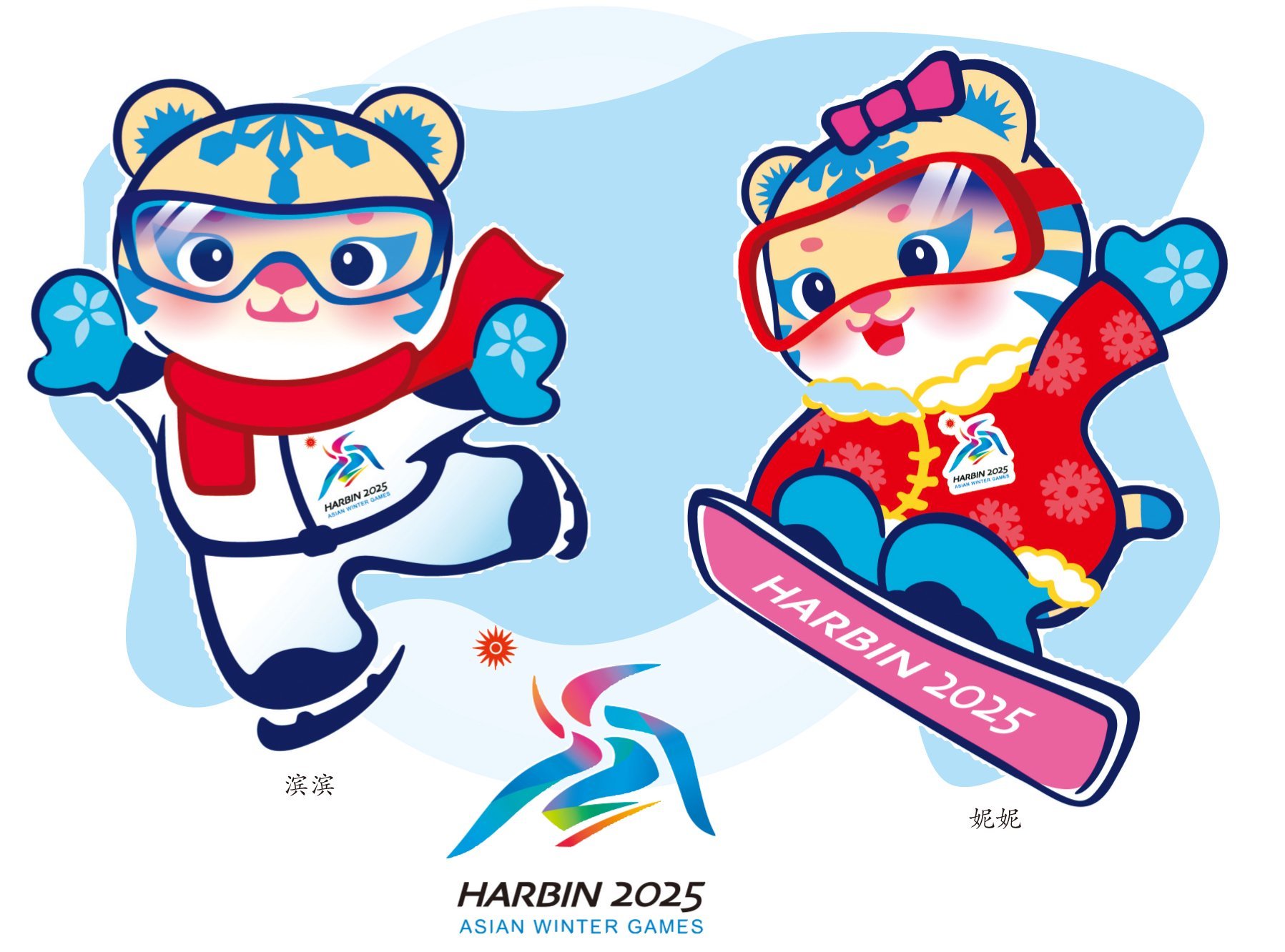 本屆亞冬會(huì)的吉祥物,是兩只可愛(ài)的東北虎。腳上穿著冰刀的那只小老虎,名字叫“濱濱”,哈爾濱的“濱”;另一個(gè)腳踩滑雪板的,名叫“妮妮”,諧音是“您”。合在一起,寓意為“哈爾濱歡迎您”。