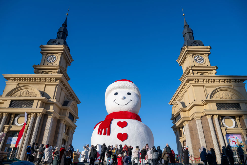 哈爾濱街頭巷尾張燈結(jié)彩,在百年老街中央大街,火紅燈籠高高掛,造型各異的錦鯉花燈栩栩如生;吉祥物“濱濱”“妮妮”向游人問(wèn)好;在太陽(yáng)島雪博會(huì),扎著紅圍巾、身貼福字的“雪韻福娃”喜氣洋洋。