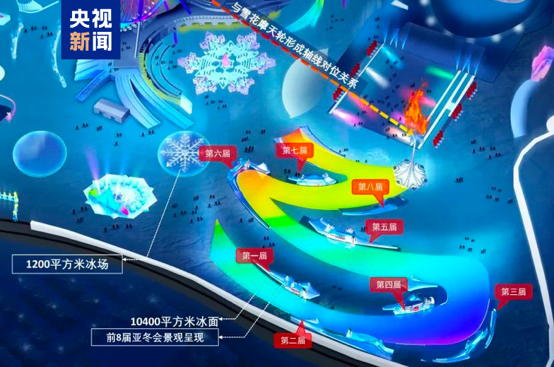 崔師堯介紹,“整個冰面有一個方向性色彩的律動,配合冰道兩邊往屆亞冬會的元素,讓人仿佛進(jìn)入了一個流光溢彩的時光隧道?!睔v史與當(dāng)代、過去與現(xiàn)在、小朋友與冠軍火炬手,在這一刻仿佛看到了傳承和發(fā)展。