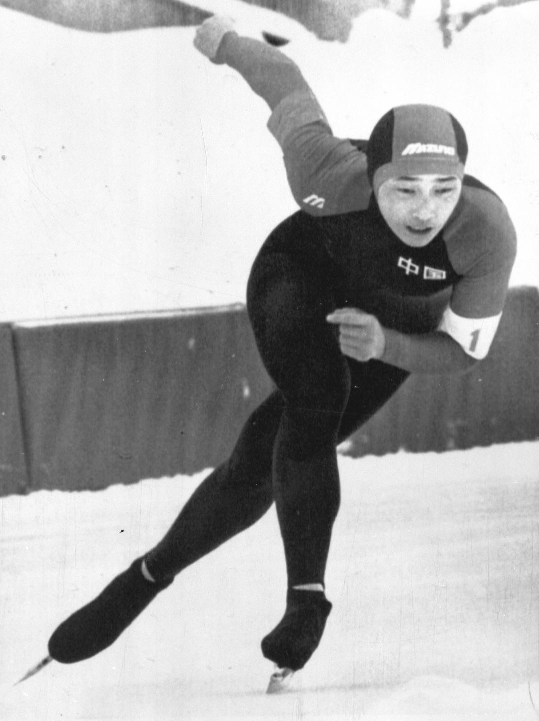 1986年3月3日,中國運動員王秀麗在日本舉行的第一屆亞洲冬運會女子1000米速滑比賽中獲得金牌。圖為王秀麗在比賽中。傳真照片(新華社發(fā))