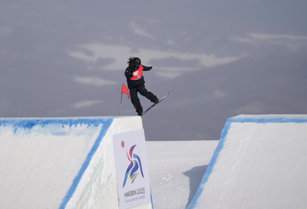 2月8日,張小楠在比賽中。當(dāng)日,在黑龍江亞布力舉行的第九屆亞冬會單板滑雪女子坡面障礙技巧決賽中,中國選手張小楠、熊詩芮包攬金銀牌。新華社記者 牟宇 攝