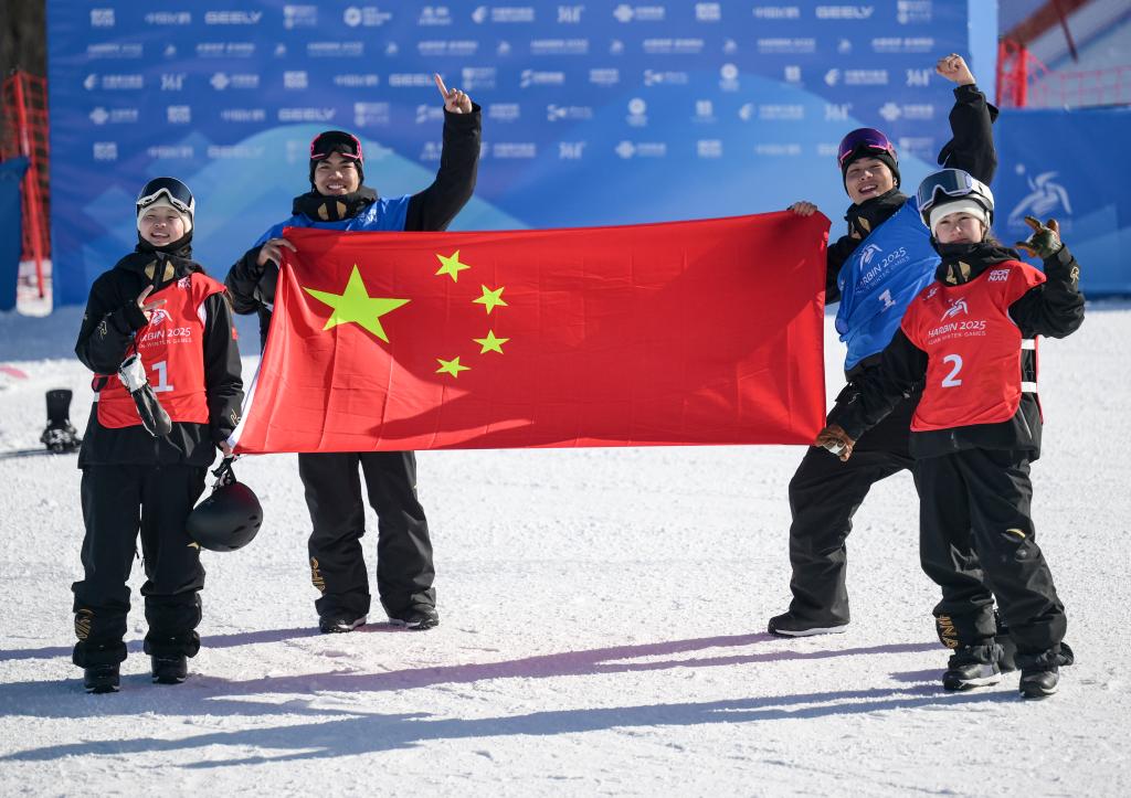 2月10日,中國選手張小楠、楊文龍、姜鑫杰與熊詩芮(從左至右)在比賽后慶祝。當日,在亞布力舉行的第九屆亞冬會單板滑雪女子大跳臺決賽中,中國選手熊詩芮奪冠,張小楠獲得亞軍;在男子大跳臺決賽中,中國選手楊文龍奪冠,姜鑫杰獲得亞軍。新華社記者 牟宇 攝