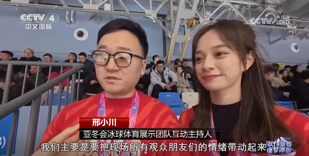 亞冬會(huì)冰球體育展示團(tuán)隊(duì)互動(dòng)主持人邢小川介紹,他們主要是帶動(dòng)所有觀眾朋友的情緒,給大家營(yíng)造濃郁的現(xiàn)場(chǎng)氛圍,可以通過大屏幕互動(dòng),給大家?guī)砀玫挠^賽體驗(yàn)。