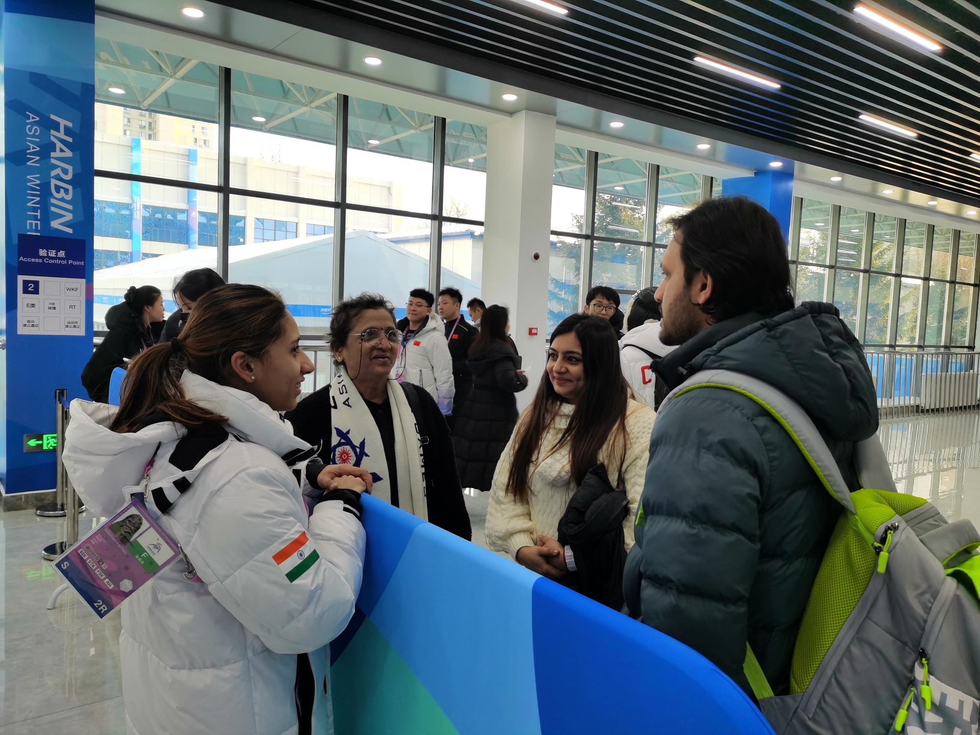 阿伊莎(后排左二)一家六口在亞冬會(huì)賽場(chǎng)外合影