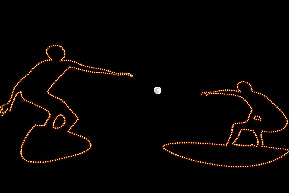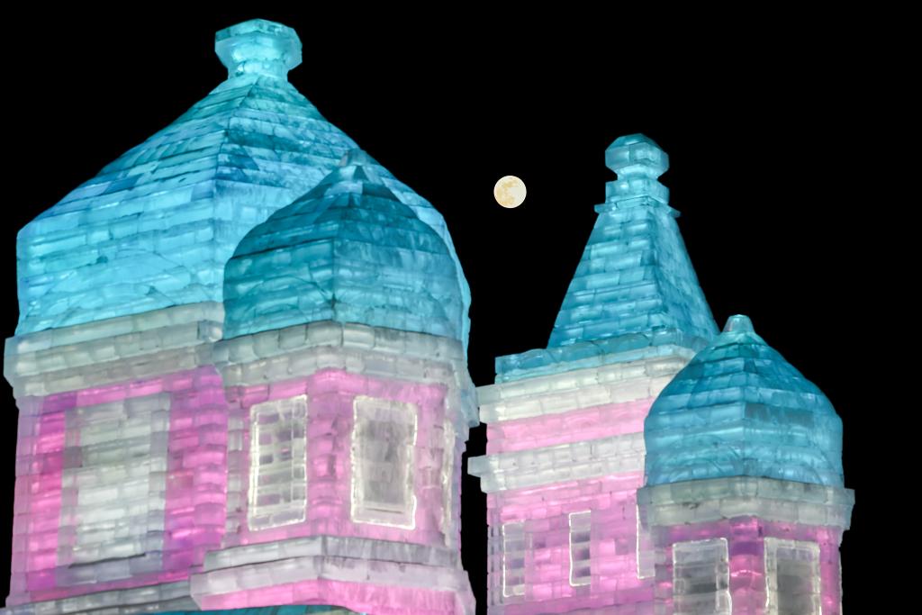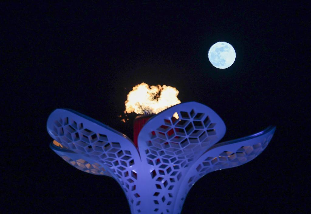 ↑在哈爾濱冰雪大世界拍攝的圓月和亞冬會主火炬。新華社記者 黃偉 攝