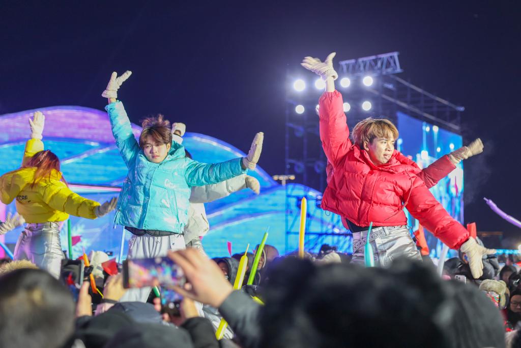 ↑演員在哈爾濱冰雪大世界舉行的“激情慶亞冬 冰雪鬧元宵”晚會上表演。新華社記者 黃偉 攝