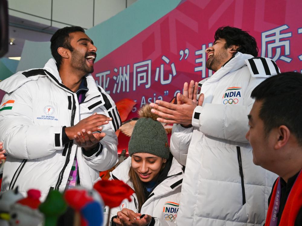↑印度代表團(tuán)速度滑冰運(yùn)動員在體驗(yàn)面塑制作。新華社記者 王曦 攝