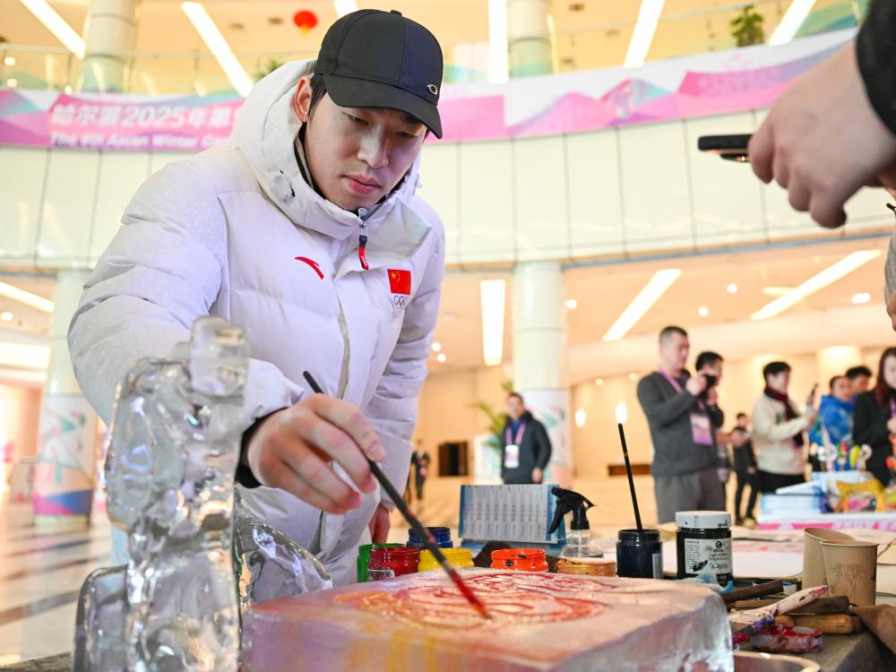 ↑在第九屆亞冬會運(yùn)動員村,中國代表團(tuán)的冰球運(yùn)動員張澤森在體驗(yàn)拓彩冰雪畫。新華社記者 王曦 攝