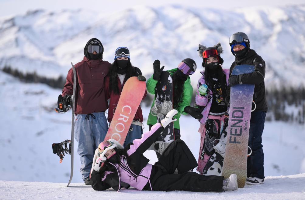 1月28日,來(lái)自浙江的“95后”姑娘張琦彬(前)與一起滑雪過(guò)年的同伴們?cè)谛陆⒗仗④娚絿?guó)際滑雪度假區(qū)合影。新華社記者 胡虎虎 攝