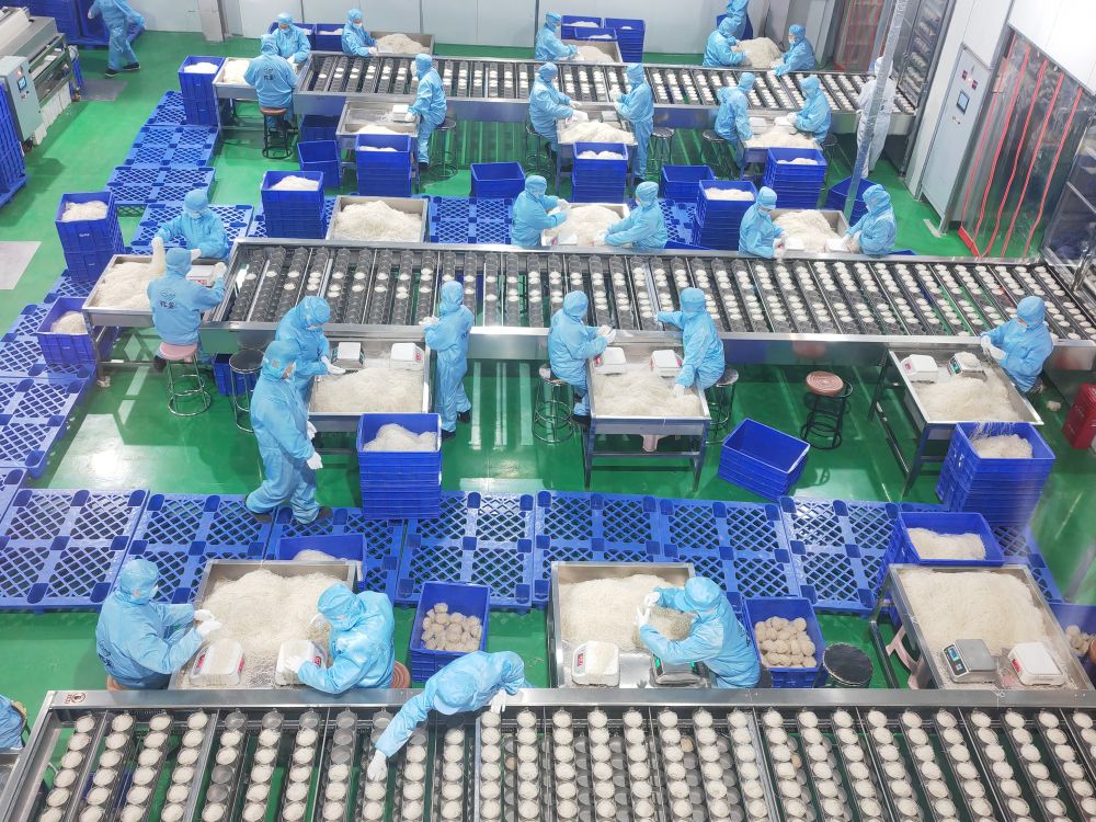 從河南引進(jìn)高產(chǎn)紅薯品種、采購(gòu)精深加工設(shè)備、搭建電商銷售團(tuán)隊(duì)、注冊(cè)“陳薯”品牌,一番操作下來,周寨村有了現(xiàn)代化的食品加工廠。進(jìn)淀粉、攪拌、定型、蒸箱熟化、掛桿……如今,記者走進(jìn)生產(chǎn)車間,只見一條條生產(chǎn)線開足馬力。據(jù)了解,這里每天可生產(chǎn)數(shù)十萬(wàn)桶紅薯粉。