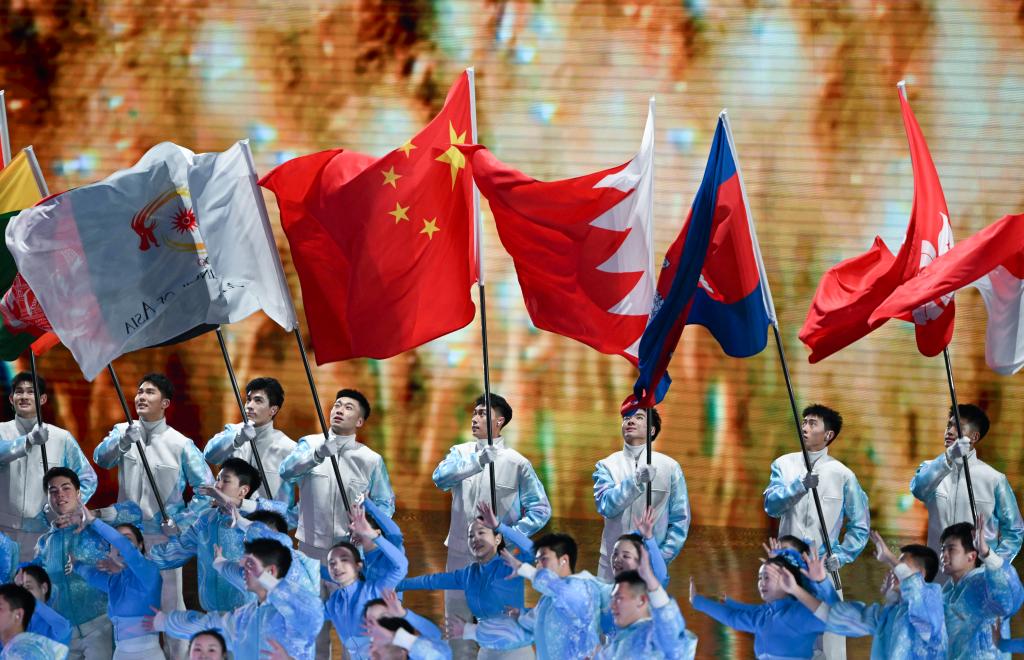 這是2月14日拍攝的各體育代表團入場環(huán)節(jié)。當日,第九屆亞洲冬季運動會閉幕式在哈爾濱舉行。新華社記者 黃博涵 攝