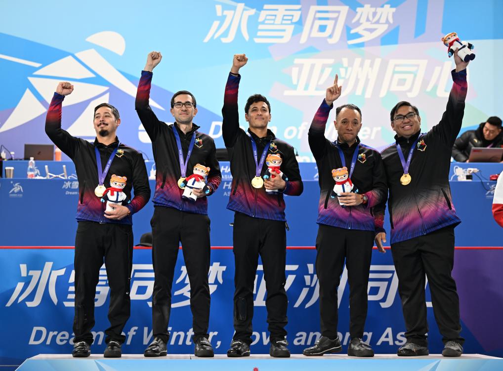 2月14日,第九屆亞冬會男子冰壺頒獎儀式在哈爾濱舉行。菲律賓隊獲得冠軍。新華社記者 趙子碩 攝
