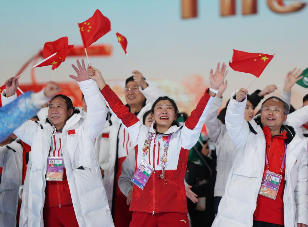 2月14日,中國(guó)體育代表團(tuán)旗手徐夢(mèng)桃(中)在亞冬會(huì)閉幕式上。新華社記者 張濤 攝