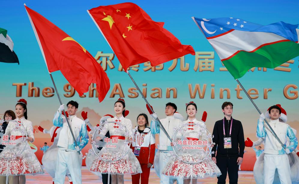 2月14日,第九屆亞洲冬季運(yùn)動(dòng)會(huì)閉幕式在哈爾濱舉行,這是各體育代表團(tuán)入場(chǎng)環(huán)節(jié)。新華社記者 許雅楠 攝