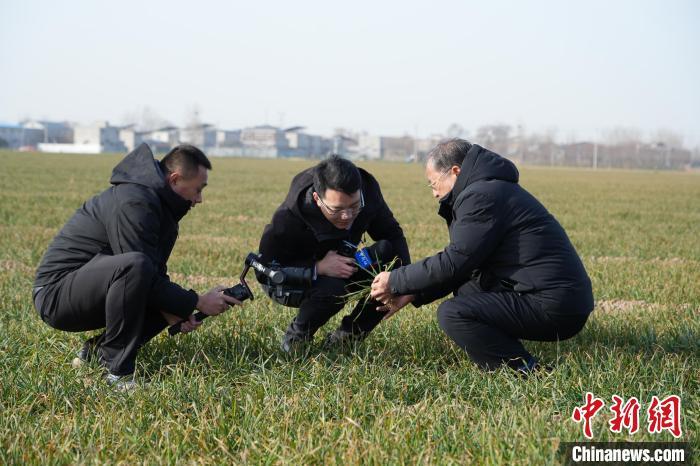 2月16日,茹振鋼在麥田里察看苗情?!≈行律缬浾?闞力 攝