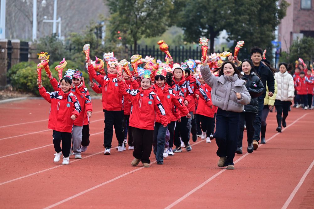 2025年2月14日,安徽省合肥市園上園小學(xué)喻崗分校師生在開學(xué)典禮上進(jìn)行“貪吃蛇”接力跑活動。新華社記者 周牧 攝