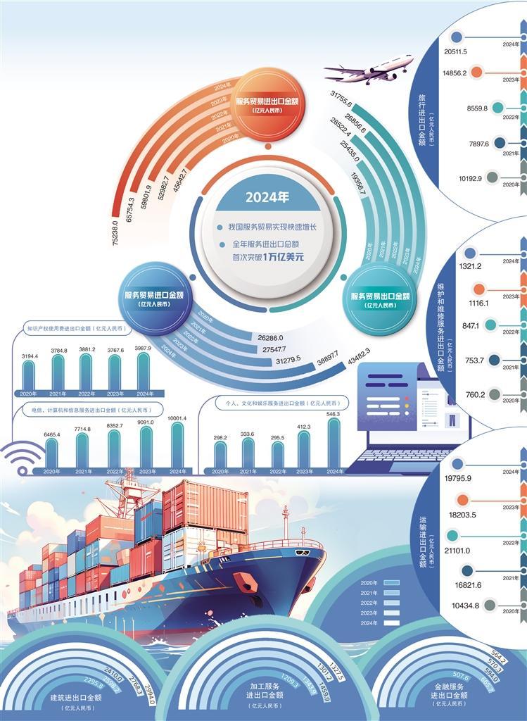 商務(wù)部數(shù)據(jù)顯示,2024年我國服務(wù)進(jìn)出口總額達(dá)7.5萬億元人民幣,同比增長14.4%,服務(wù)貿(mào)易規(guī)模首次突破1萬億美元,再創(chuàng)歷史新高。我國服務(wù)貿(mào)易實(shí)現(xiàn)了令人矚目的快速增長,展示了經(jīng)濟(jì)發(fā)展的活力和韌性,背后是多個(gè)領(lǐng)域的協(xié)同發(fā)力。
