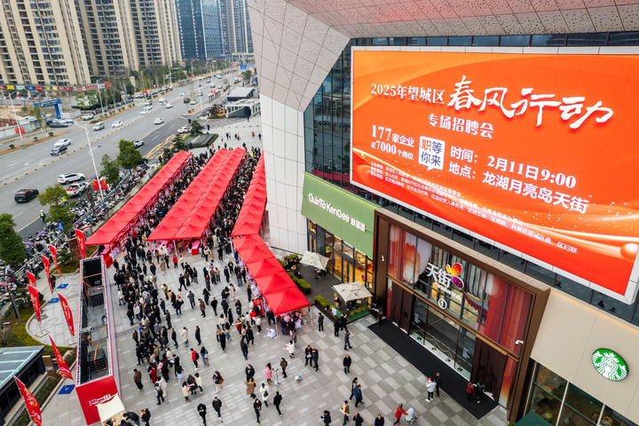 這是2025年2月11日在湖南省長沙市望城區(qū)龍湖月亮島天街商場外坪拍攝的招聘會現(xiàn)場(無人機(jī)照片)。新華社記者 陳思汗 攝