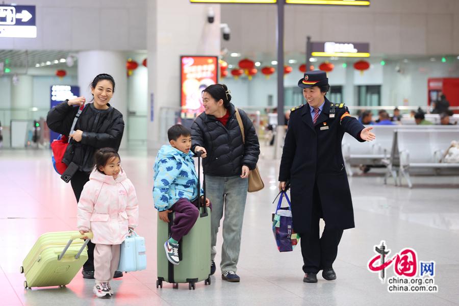 2025年春運(yùn)期間 ,南昌站工作人員為旅客指引候車位置。中國網(wǎng)發(fā) 劉慕/攝