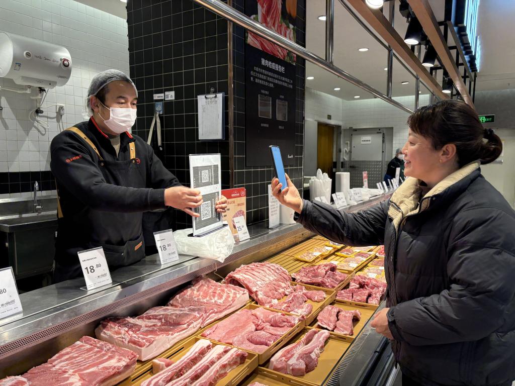 貴陽市一家豬肉生鮮門店內,消費者手機掃碼查看相關產品信息。新華社記者 李凡 攝