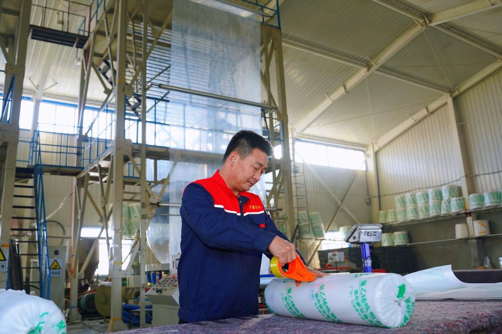 春耕備耕離不開充足的農(nóng)資供應(yīng)。在新疆昌吉回族自治州吉木薩爾縣三臺(tái)鎮(zhèn)天露節(jié)水材料有限公司的生產(chǎn)車間,制膜機(jī)器高速運(yùn)轉(zhuǎn),一卷卷嶄新的地膜源源不斷地“吐”出,工人們熟練地進(jìn)行切割、封裝、碼放等作業(yè)。