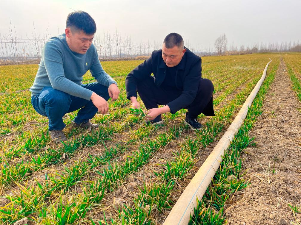 山東省嘉祥縣金屯鎮(zhèn)賀李胡村種糧大戶張春杰(左一)正在和村干部一同查看麥苗長勢(shì)。(受訪對(duì)象供圖)