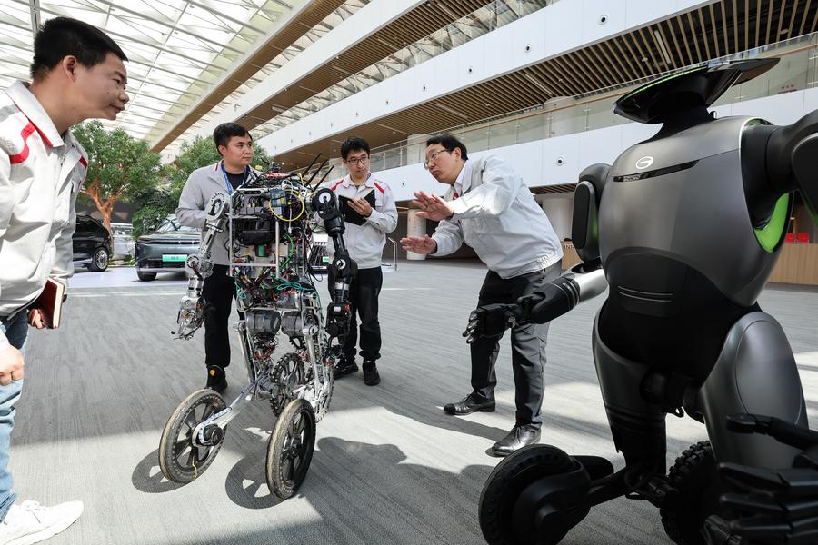 2025年2月24日,全國人大代表馮興亞(右一)在廣州向廣汽第三代具身智能人形機(jī)器人團(tuán)隊工程師了解該型機(jī)器人的AI自主控制技術(shù)突破和應(yīng)用場景創(chuàng)新情況。新華社記者 劉大偉 攝