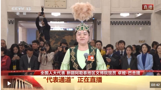 今天(3月11日),十四屆全國人大三次會議第三場“代表通道”在人民大會堂舉行,全國人大代表、新疆阿勒泰地區(qū)文博院館員卓婭·巴合提接受記者采訪。