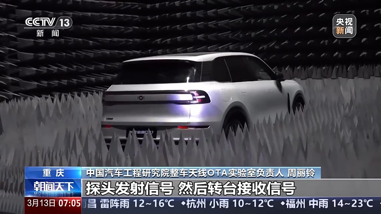 中國汽車工程研究院整車天線OTA實驗室負(fù)責(zé)人 周麗鈴:這里是我們的一個探頭,然后配我們的轉(zhuǎn)臺,探頭發(fā)射信號,然后轉(zhuǎn)臺接收信號,這樣的話就可以測汽車的接收性能,那它們互換一下就可以測汽車的一個發(fā)射的性能。