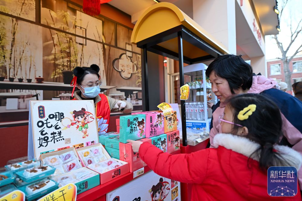 游客在天津哪吒小鎮(zhèn)購(gòu)買(mǎi)糕點(diǎn)產(chǎn)品(3月16日攝)。