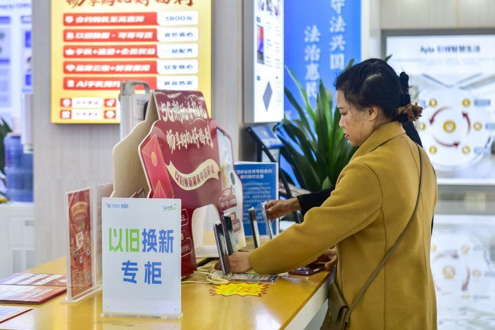 2月21日,在廣西東興市一家手機(jī)賣場,消費者在查看手機(jī)以舊換新的機(jī)型。新華社記者 曹祎銘 攝