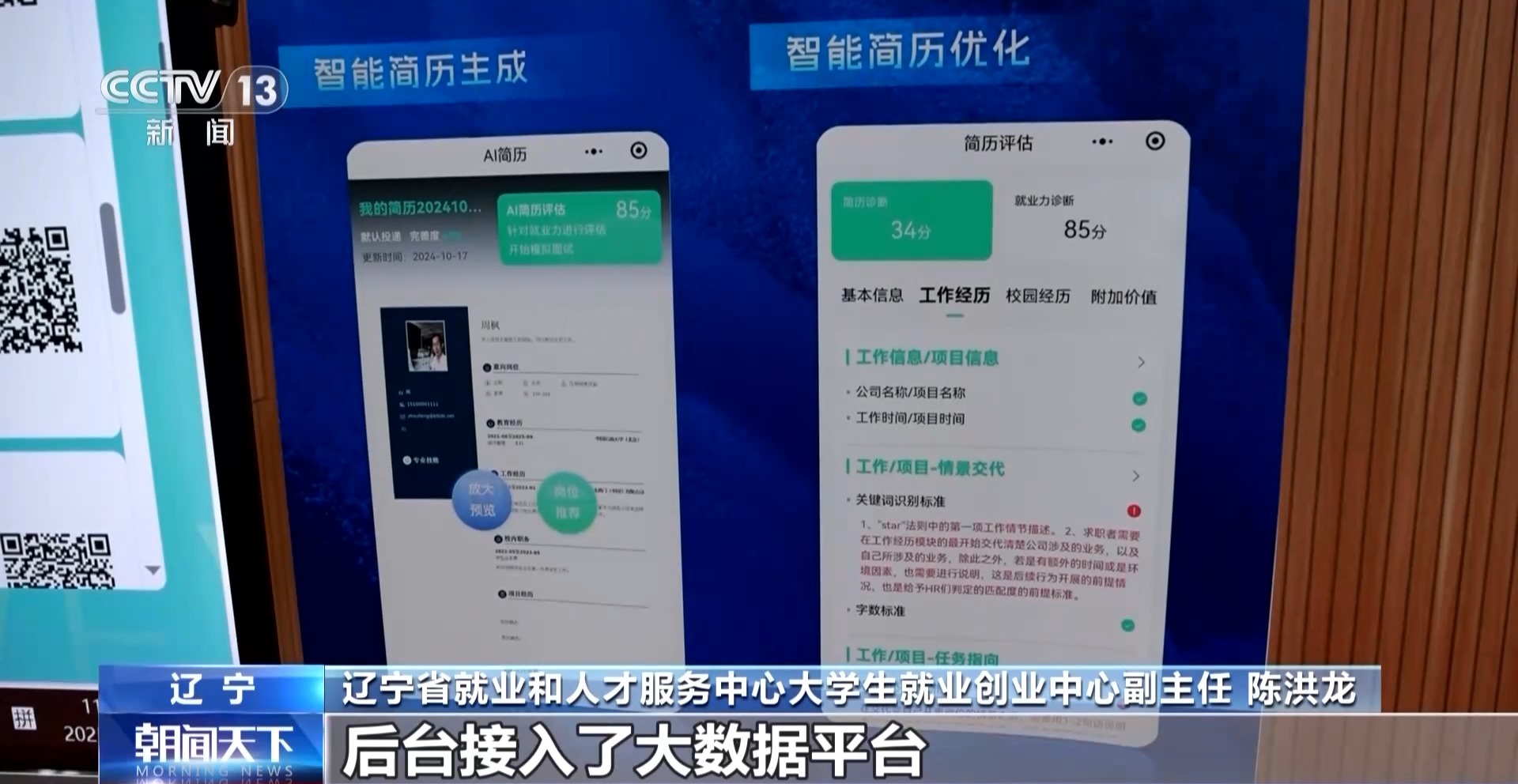 遼寧省就業(yè)和人才服務(wù)中心大學(xué)生就業(yè)創(chuàng)業(yè)中心副主任 陳洪龍:后臺接入了大數(shù)據(jù)平臺,這里面有我們的職業(yè)指導(dǎo)師和人力資源的指導(dǎo)數(shù)據(jù)大模型,優(yōu)化之后孩子們成功的概率會大大提升。