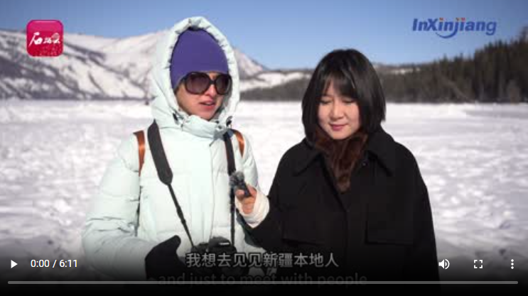 受邀做客本期《InXinjiang》欄目訪談的,是來自白俄羅斯的記者瑪麗娜。這是她第二次到新疆,走在喀納斯湖冰面上,她被眼前的美景和當?shù)刎S富多彩的文化活動深深吸引?,旣惸入y掩內(nèi)心歡喜:“現(xiàn)代化基礎設施與自然美景相得益彰,這是我喜歡新疆的理由。”