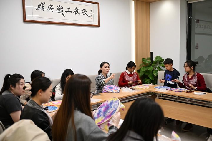 雄安新區(qū)職工夜校的學(xué)員在容東康寧雄觀書屋內(nèi)制作扎染(2025年3月14日攝)。新華社記者 牟宇 攝