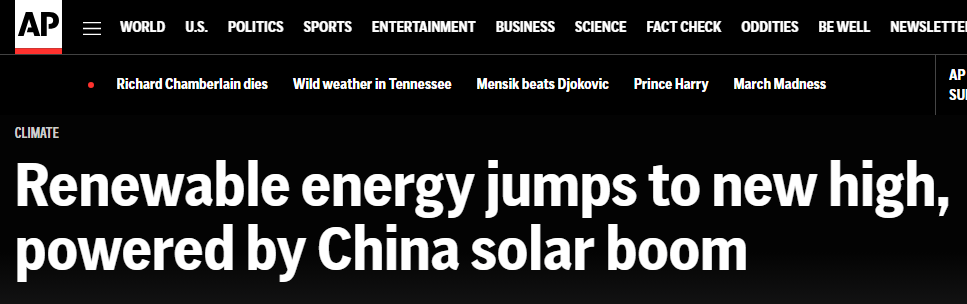 報(bào)道稱,中國(guó)太陽(yáng)能熱潮推動(dòng)了全球可再生能源發(fā)展。數(shù)據(jù)顯示,2024年,中國(guó)可再生能源發(fā)電新增裝機(jī)約3.74億千瓦,其中四分之三來(lái)自太陽(yáng)能發(fā)電。