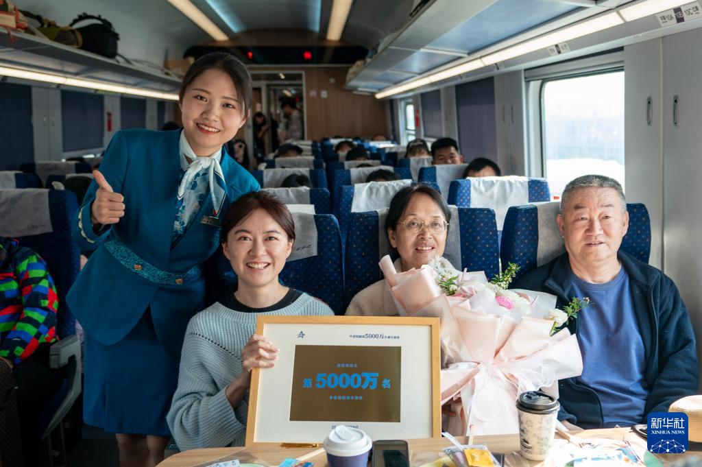 3月28日,中老鐵路第5000萬名旅客孫怡薇(前右三)與父母及乘務員在列車上合影留念。