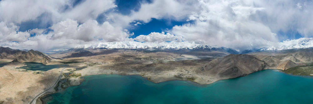 新疆帕米爾高原上公格爾九別峰和慕士塔格峰山腳下的湖泊濕地景觀(2020年6月16日攝,無人機(jī)全景照片)。新華社記者 胡虎虎 攝