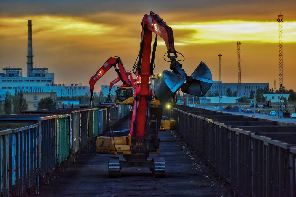 新疆霍爾果斯站換裝庫(kù)換十線抓料機(jī)對(duì)散堆裝貨物換裝作業(yè)(2023年9月6日攝)。新華社記者 趙戈 攝