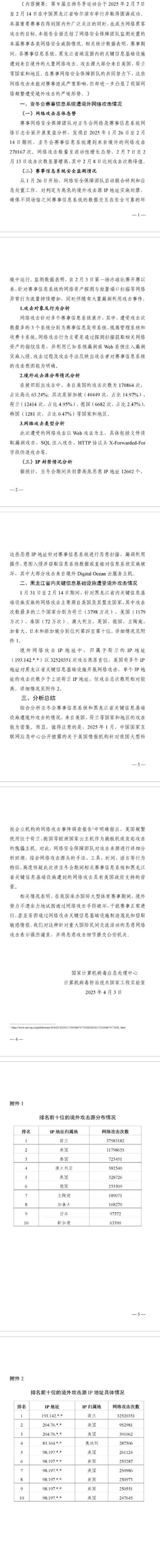 新華社哈爾濱4月3日電(記者王君寶 張建新)3日,國(guó)家計(jì)算機(jī)病毒應(yīng)急處理中心計(jì)算機(jī)病毒防治技術(shù)國(guó)家工程實(shí)驗(yàn)室發(fā)布“2025年哈爾濱第九屆亞冬會(huì)”賽事信息系統(tǒng)及黑龍江省內(nèi)關(guān)鍵信息基礎(chǔ)設(shè)施遭境外網(wǎng)絡(luò)攻擊情況監(jiān)測(cè)分析報(bào)告,內(nèi)容顯示2025年1月26日至2月14日期間,亞冬會(huì)賽事信息系統(tǒng)遭到來(lái)自境外的網(wǎng)絡(luò)攻擊達(dá)270167次。