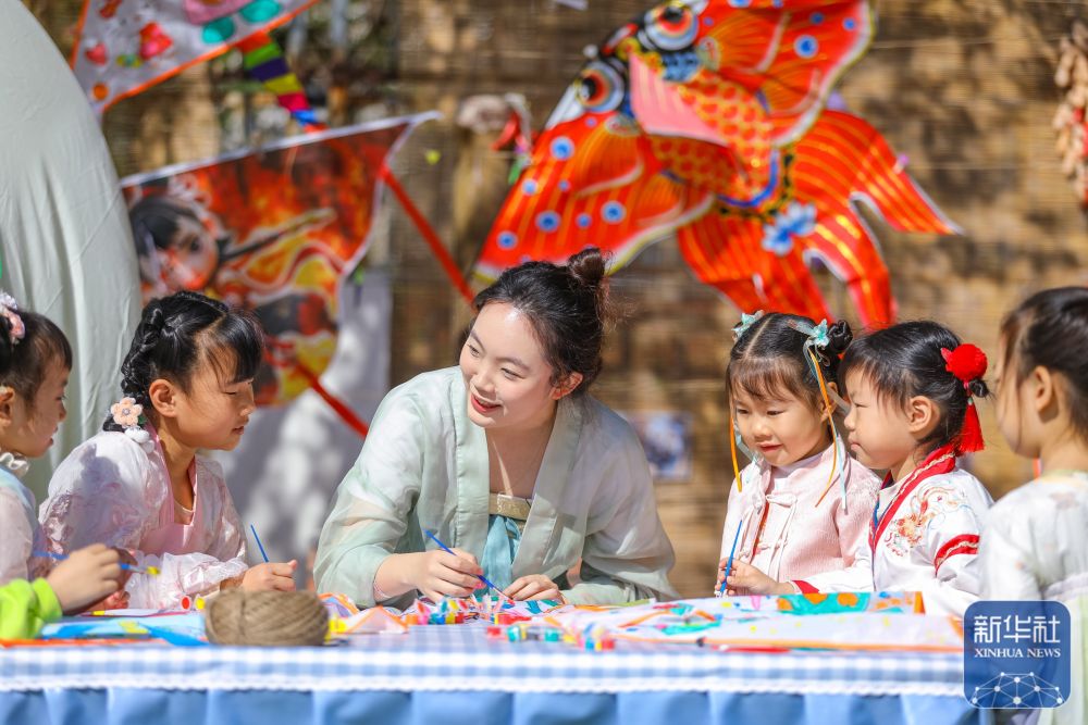 ↑ 4月2日,在山東省青島市李滄區(qū)青峰路幼兒園開展的迎清明活動中,老師指導小朋友繪制紙鳶。新華社發(fā)(張鷹攝)