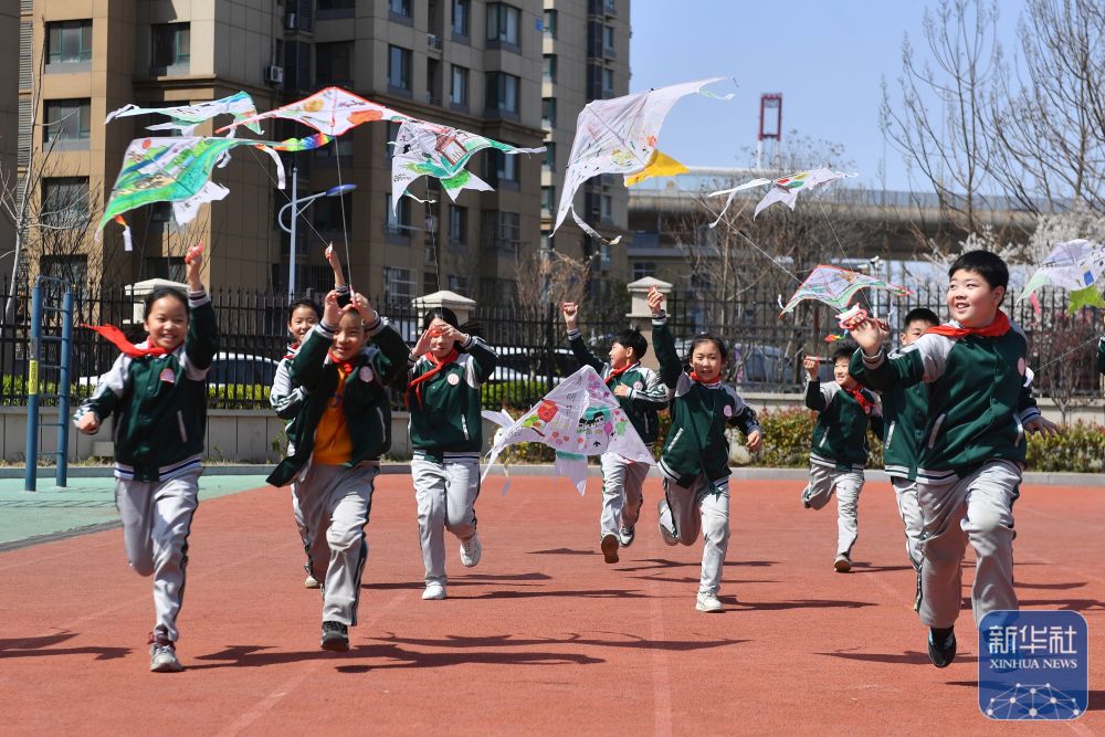 ↑ 4月2日,學生們在山東省青島市市北區(qū)普新小學開展的民俗迎清明活動上放風箏。新華社發(fā)(王海濱攝)