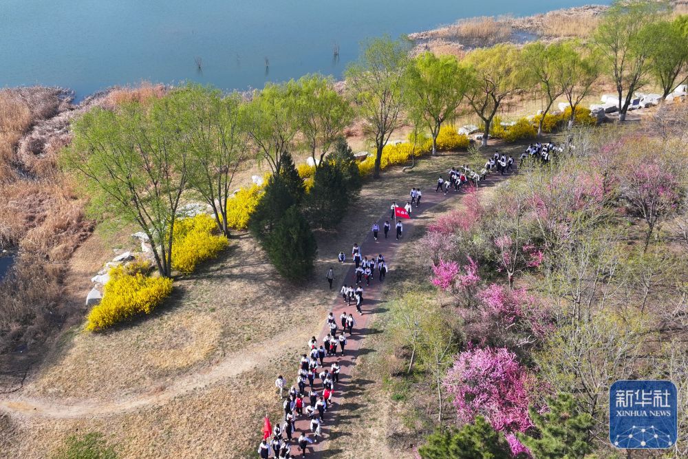 ↑ 4月3日,山東省高密市第五中學的中學生在膠河國家濕地公園參加踏青遠足活動(無人機照片)。新華社發(fā)(李海濤攝)