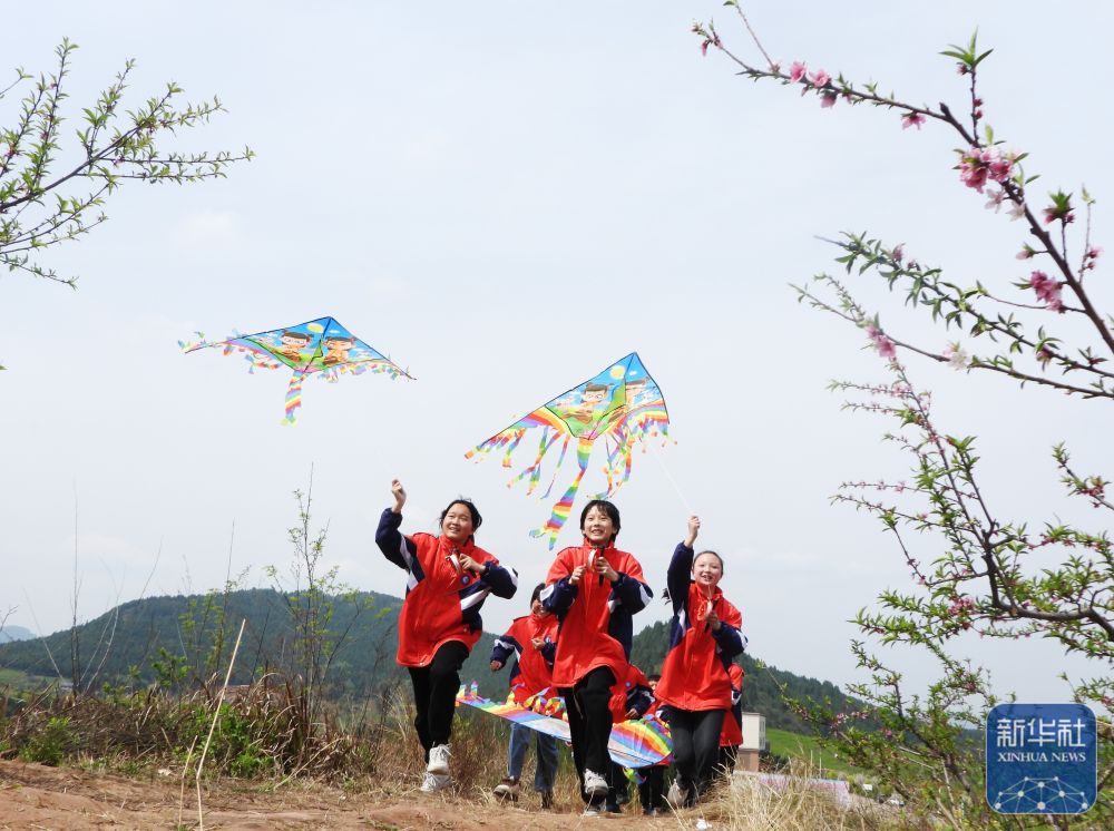 ↑ 4月3日,四川省達州市渠縣新市鎮(zhèn)第一小學學生在陽光大課間放風箏。新華社發(fā)(鄧良奎攝)